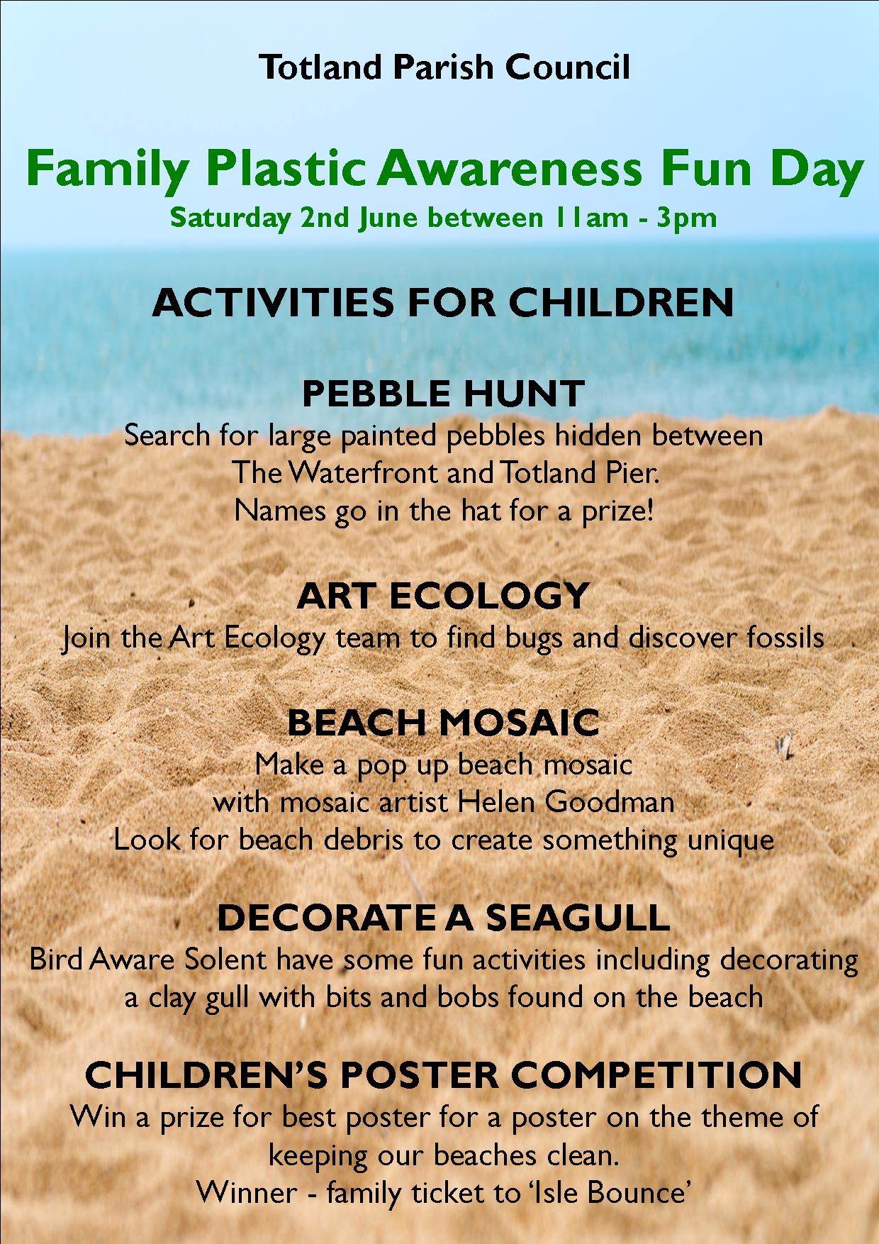 Totland Parish Council are pleased to present our first Plastic Awareness Family Fun Day. We have teamed up with campaigning group Plastic Aware to organise a day in which people can get advice about how they can make changes to their own plastic use in order to ‘do their bit’ towards combating the serious issue of excessive plastic consumption.